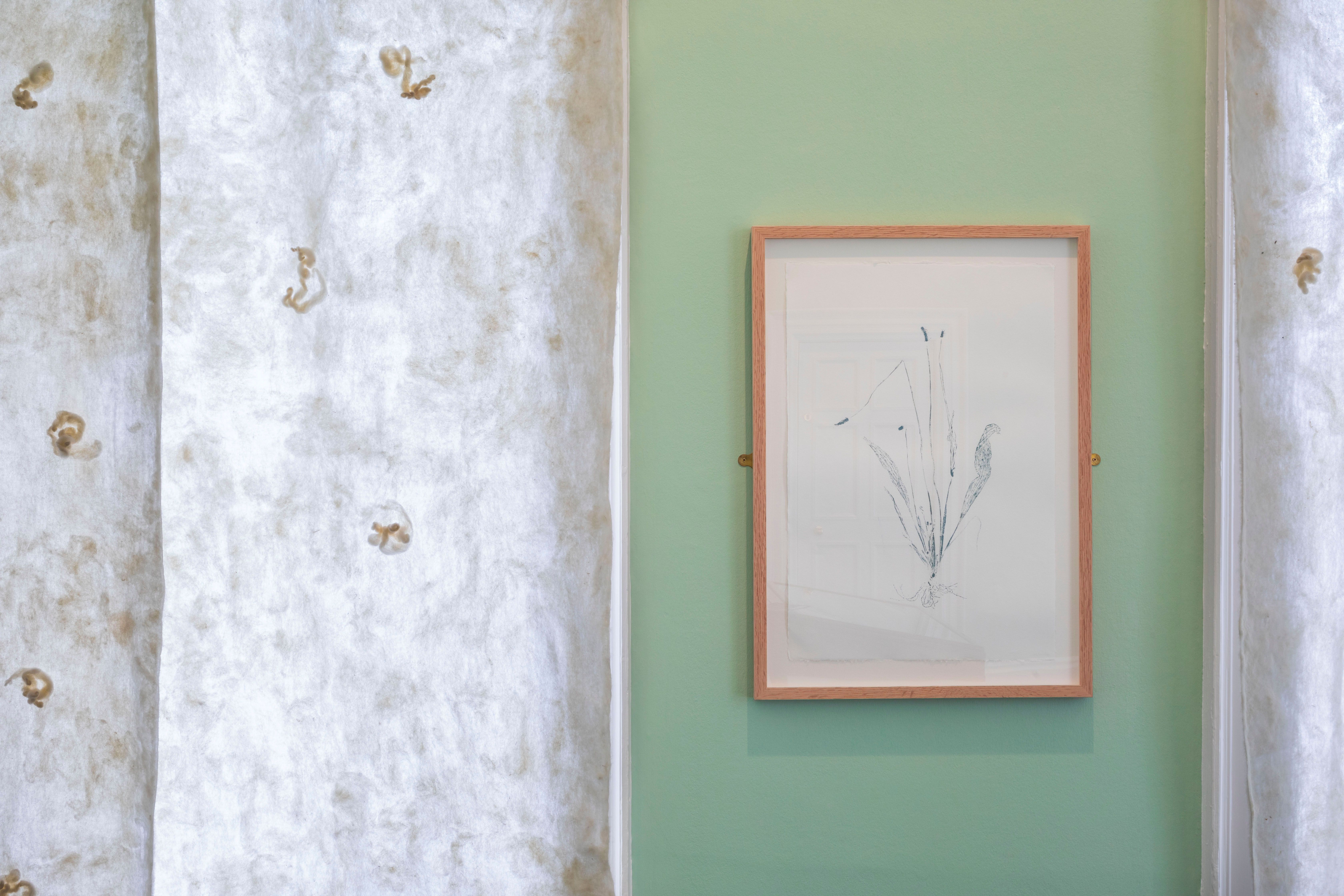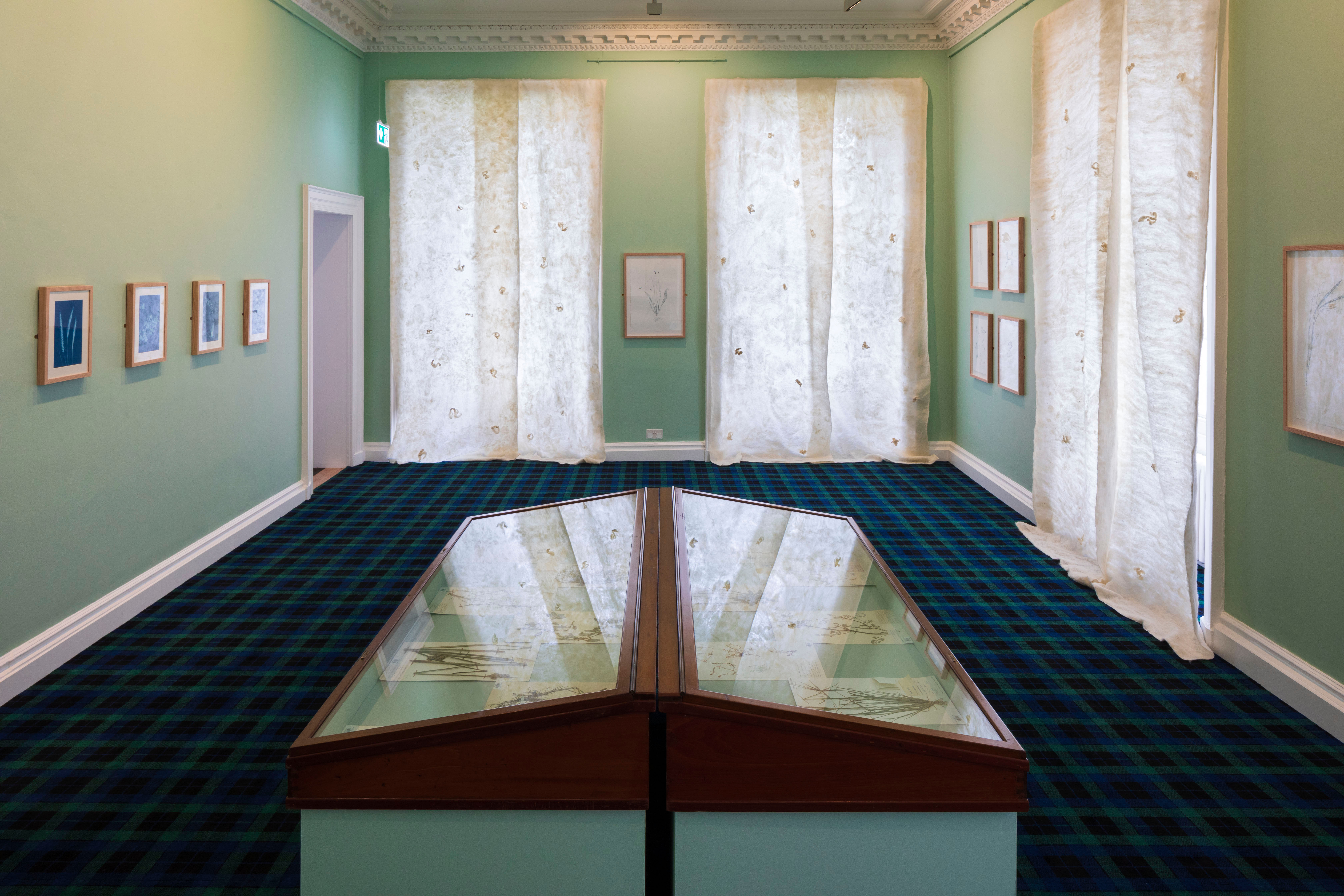 In a later room we learn that prickly pear (a species of cacti originating in Oaxaca, Mexico) was taken to Australia only to become so invasive that multiple techniques had to be employed to kill, burn, poison and cut it down. Bright pink silks (dyed with cochineal beetles who lived on the plant) featuring illustrations which depict each of these techniques hang around the room. The final space brings us back to Scotland, where de Souza explores the phenomenon of seeds native to Australia and New Zealand being inadvertently carried in the fleeces of sheep when transported here to make tartan.